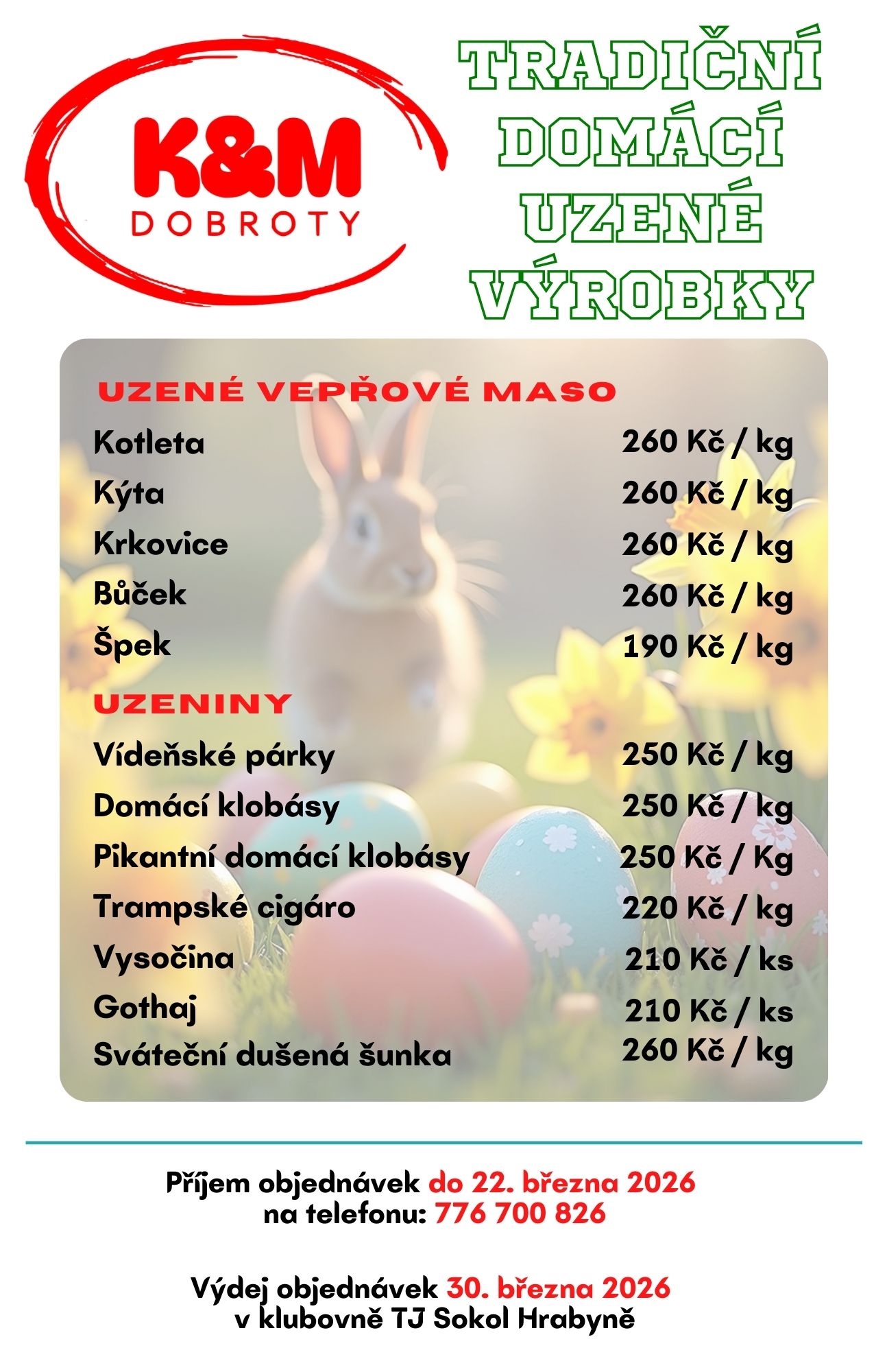 Objednat si můžete prostřednictvím telefonu: 776700826 nebo na emailu: kmdobroty@seznam.cz.